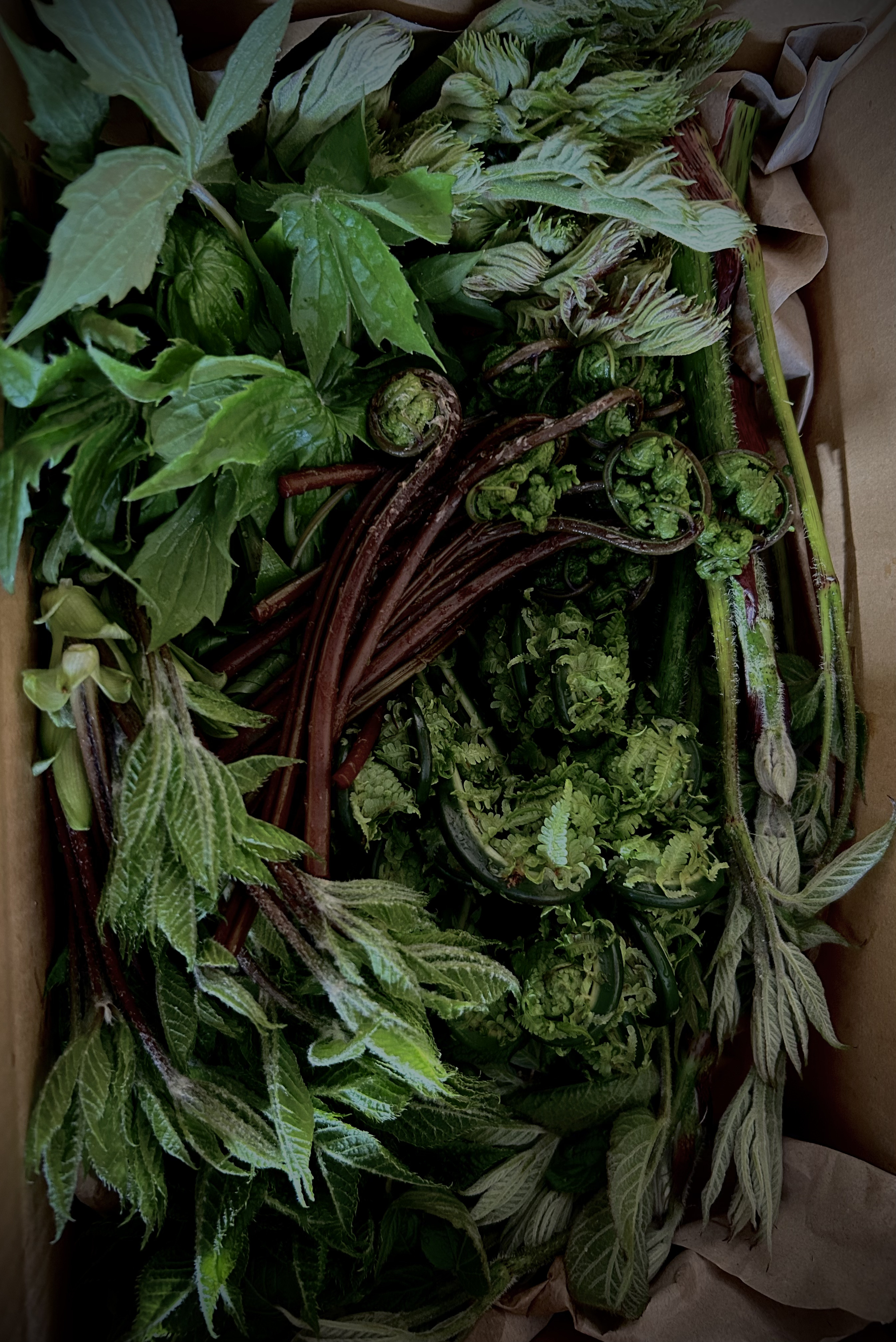 【山菜例】ふきのとう・青こごみ・赤こごみ・タラの芽・コシアブラ・アイコ・しどけ・ヤマウド・うるい・シオデ・ワラビなど