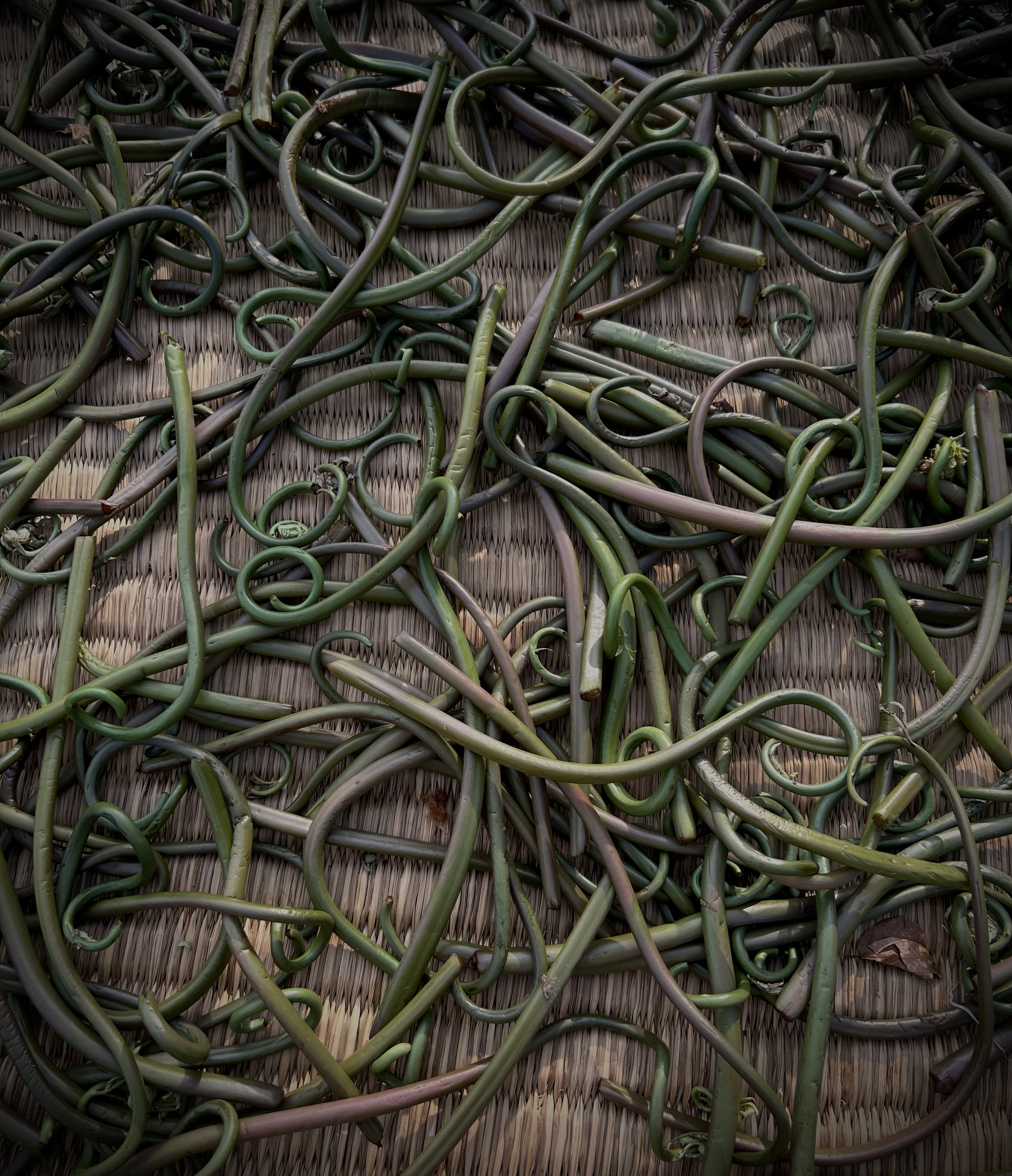 昼頃に家に戻ると、沸騰させた大鍋にぜんまいをドサッと入れて湯通し、鮮やかな緑色に茹で上がったら、筵やゴザに並べて天日で干しながら揉む。最初はハンドボールのような大きさにまとめて筵にしっかりと押し付けて揉む。徐々に乾燥し、固まってきたら、ぜんまいが折れないように丁寧に揉む。乾燥が進むにつれて赤色、黒色と変化していく。骨が折れるが、揉み具合が仕上がりの良し悪しを決めるのでとても大事な作業。3日ほど干すと、ぜんまいの量は1/10ほどになり、それらをいったん保管する。雨季が来るころに保管した乾燥ぜんまいを塩茹でをし、一日干す。これは、夏に虫がついてしまうのを防ぐため。最後に一本一本はさみで足切りをする。採取から長い工程を掛けて出来上がった乾燥ぜんまいは、こうして出来上がる。