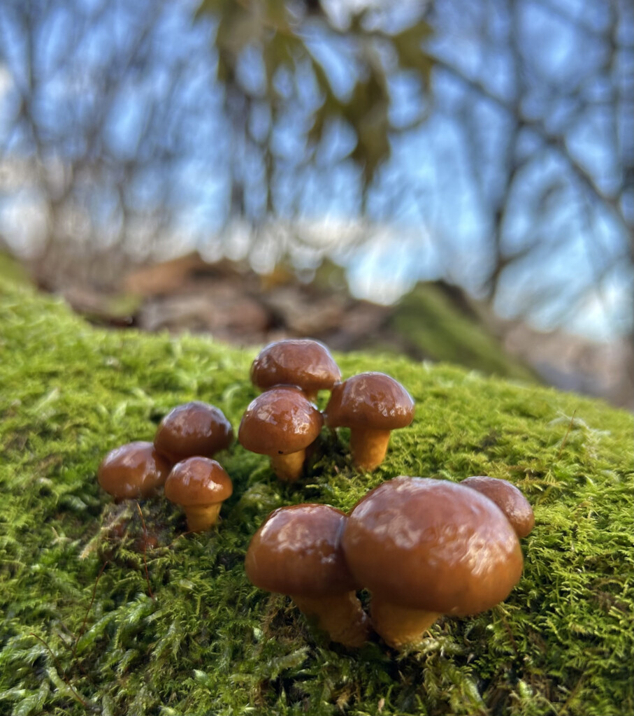 採れた原木なめこ。幾分か木屑がついているけれど、滑りが反射してキレイ。粒と中開きのなめこ。傘が肉厚になる。なめこはナイフで根元から切ると木屑が付きにくく、キレイに取れる。枯葉や土がつかないようにしながら持ち帰ります。